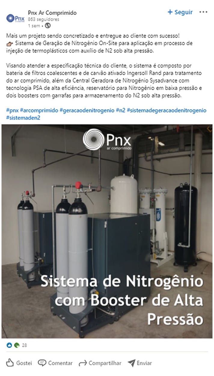 A geração de nitrogênio na sua própria empresa é possível a partir da utilização do ar comprimido, em um Sistema de Geração de Nitrogênio On-Site, a partir do sistema PSA (Pressure Swing Adsorption). Este sistema é comercializado ou locado pela Pnx, de acordo com as necessidades de cada cliente. Consulte a nossa equipe pelo lik da bio @pnxarcomprimido 👈